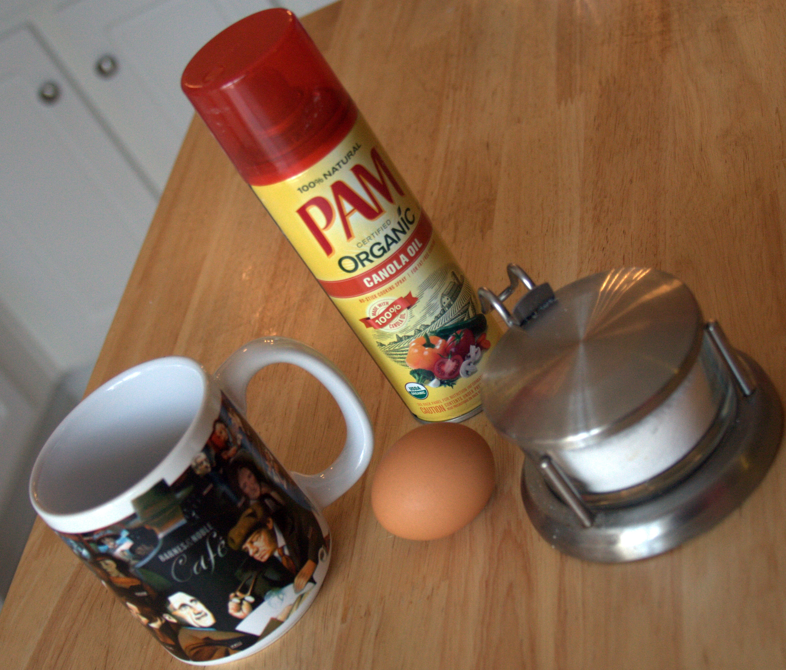 Start with an egg, a flat bottomed coffee mug, cooking spray, and salt. If you like an egg sandwich, go ahead and pop your bread into the toaster before you even look at the egg.