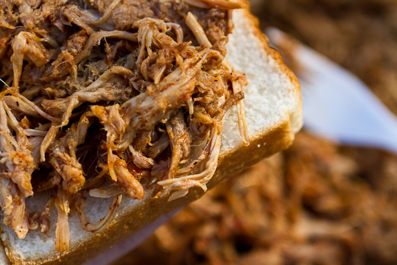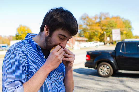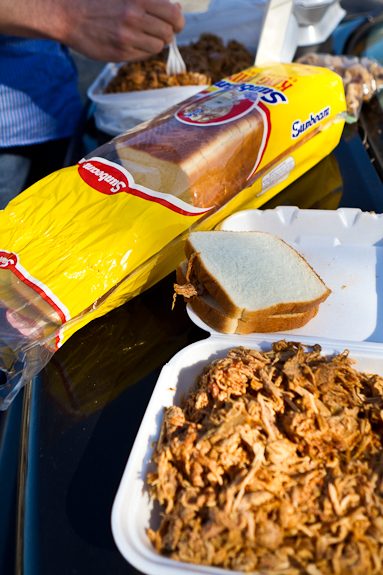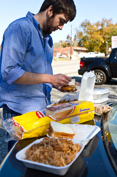 It’s a 4-5 hour trip to get there and back. Hemingway isn’t exactly a convenient place to get to, luckily we have some gorgeous state highways to make the trip more enjoyable. A cup of coffee and some LCD Soundsystem didn’t hurt either though. Scott’s doesn’t really cater to the dine in crowd, in fact there is only one table inside, but we weren’t there for a fine dining experience, we were there for barbecue! Hunter and I posted up on the trunk of his car with a loaf of Sunbeam White Bread and our cartons hickory smoked, vinegary, peppery, porky goodness. I would have driven 8 hours for this. Pork, smoke, heat, and just a bit of tanginess. This is good barbecue. Thank goodness Hunter had the foresight to grab a bag of chicharrones with his order so we could snack on those all the way home instead of finishing off one or two of the boxes of cue in the back seat. It’s been a couple of weeks now and I’ve still got a pound left in the freezer, butif it weren’t for Thanksgiving, I doubt it would make it through the week. I’m ready to go back!