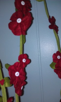 I spotted this garland in the Christmas shop in Jonesborough a while back. Excuse the sad photo quality, but it’s felt flowers with a button in the center attached to a wire covered in green cloth.