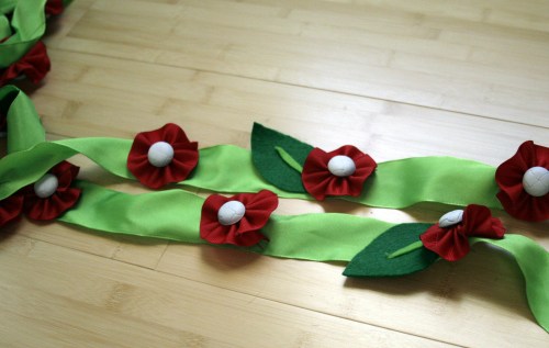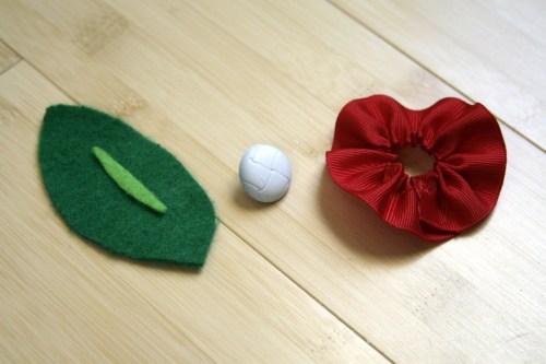 I built my flowers out of red ribbon. If you stitch up the side of the ribbon, pull tight, and tie it off, you get a nice little flower shape. I didn’t have any white buttons, but I did have some ugly brown buttons and a can of spray paint. The leaves were just cut from pieces of felt.