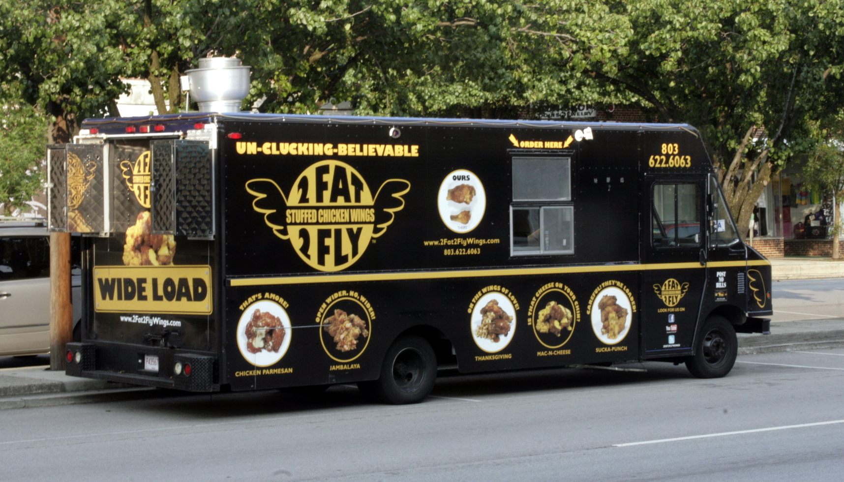 2 Fat 2 Fly is a food truck in Columbia, but they frequently have “events” and are in one position for a period of time. Keep up with their location on Twitter, Facebook, or the 2 Fat 2 Fly website.
