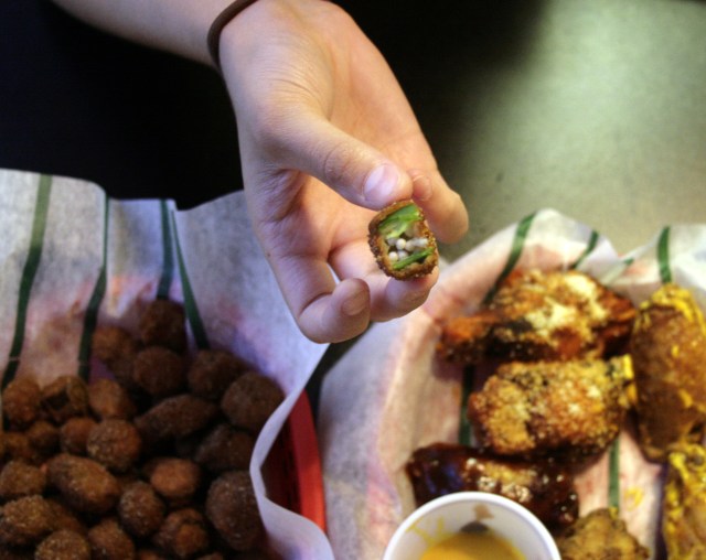 Okay, I don’t usually go for fried vegetables, but Forrest insisted that this okra was great. Look at how beautiful it was on the inside! It was spicy and fresh and lovely! If you’ve eaten a fried veggie before, you know they don’t usually look that way.